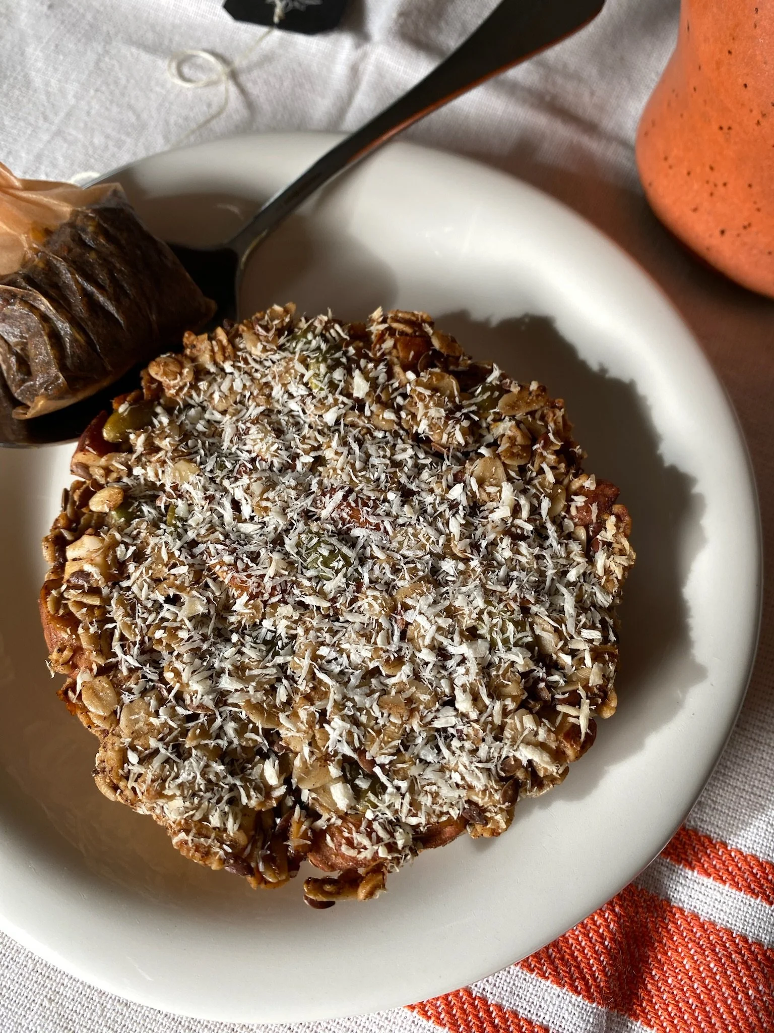 Ingredients: Rolled oats, enriched flour (unbleached wheat flour, malted barley flour, niacin, iron, thiamin mononitrate, riboflavin, folic acid), dried figs, almonds, flax seed, pepita, brown sugar, sugar, butter, coconut oil, maple syrup, locally sourced and/or organic egg whites, vanilla, five-spice powder, salt, baking powder, turbinado sugar. Contains wheat, eggs, milk, tree nuts